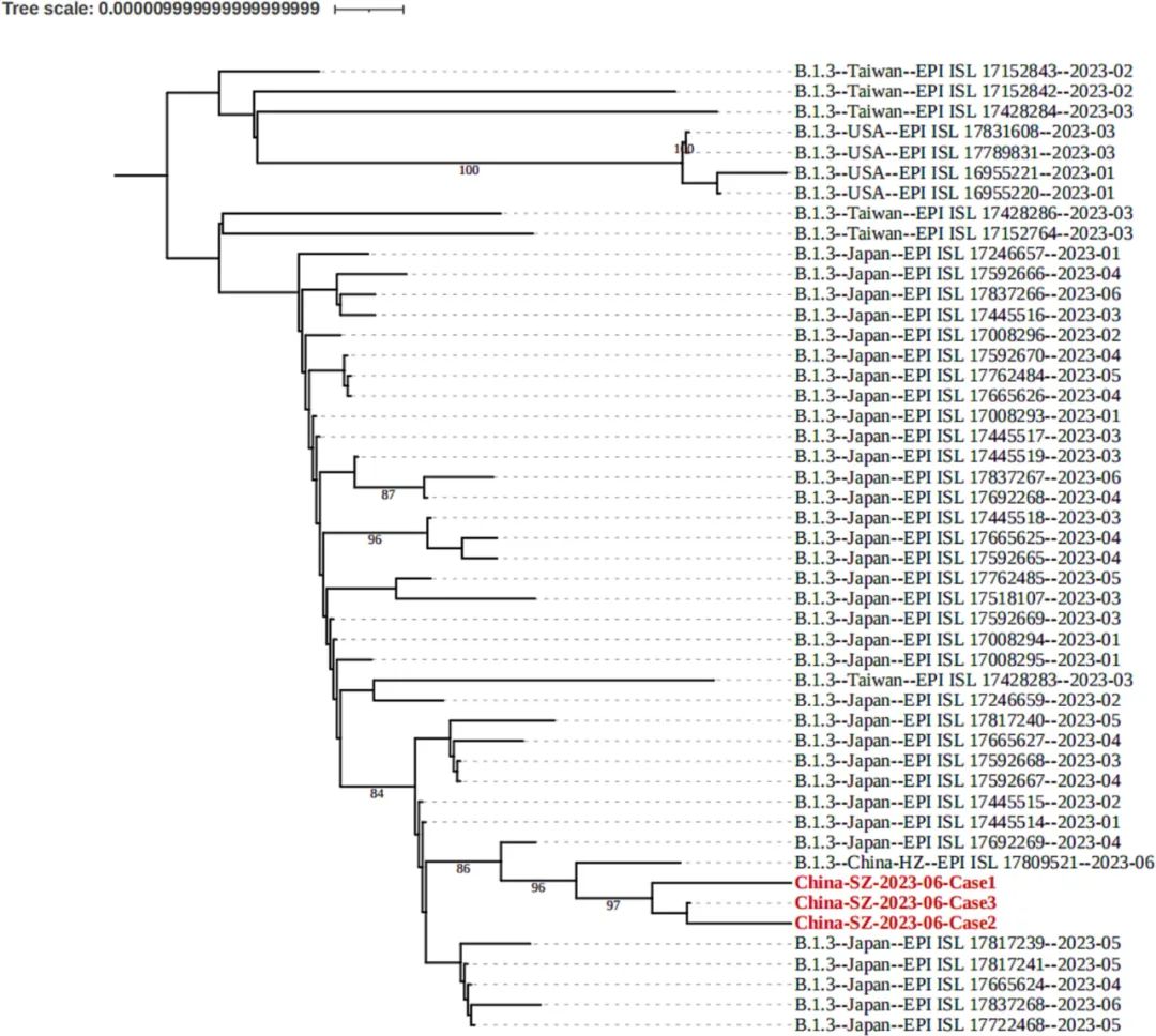 研究人員通過基因組測序的Nextclade分析(https://clades.nextstrain.org/),確定了深圳三例病例均感染了人類猴痘病毒(hMpxV,B.1.3進化分支)。對已識別的猴痘病毒進行進一步的溯源研究,研究人員對全球所有B.1.3基因序列進行了系統發育樹分析,發現深圳和杭州的四個本地病例與最近許多日本猴痘病例處于同一進化分支上。從進化的角度來看,這四個中國病例與2023年1月、2月和3月收集的日本株系(GISAID ID: EPI_ISL_17445514,EPI_ISL_17445515,EPI_ISL_17692269)高度同源。